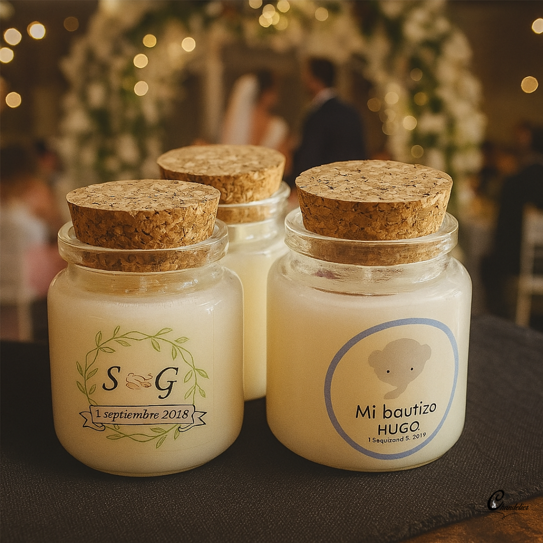 Nuestros tarros de cera natural son el regalo perfecto para tus invitados: delicados, elegantes y totalmente personalizables.